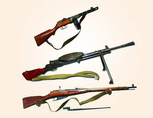 Ружейный ремень на стрелковом оружии Красной Армии. Пистолет-пулемет Шпагина, ручной пулемет Дегтярева, винтовка Мосина