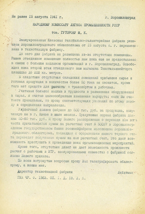 Первой двинулась в путь Киевская текстильно-галантерейная фабрика. Как следует из архивных документов, в июле 1941 года она ещё продолжала работу и успела передать Укрлегснабу продукцию на 500 тыс. рублей. Но фронт неумолимо приближался к Днепру. И 23 июля по указанию Наркома лёгкой промышленности Украинской ССР М. К. Гуторова фабрика «в порядке эвакуации» была направлена в Ворошиловград (ныне – Луганск). Вместе с оборудованием были отправлены «некоторое количество сырья и готовой продукции» (более 50 тонн), часть руководящего состава и квалифицированных рабочих1. Руководил эвакуацией директор фабрики Юзеф Михайлович Лейхтман.