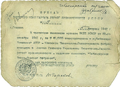 Вот что рассказывают о прибытии фабрики на Волгу архивные документы. И первый из них – Постановление Совета Народных Комиссаров Чувашской АССР № 1683/358 от 7 октября 1941 г. «О размещении эвакуированной из г. Киева Басонной фабрики»:
