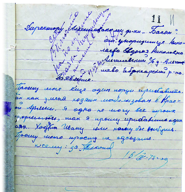 «Прошу дать мне расчёт, потому что у меня отец на фронте и брат тоже на фронте, а мать – инвалид. Всё уже я распродала, и на эти деньги не проживу. Нету одежды. Прошу не отказать. 3 июля 1943 г.»
