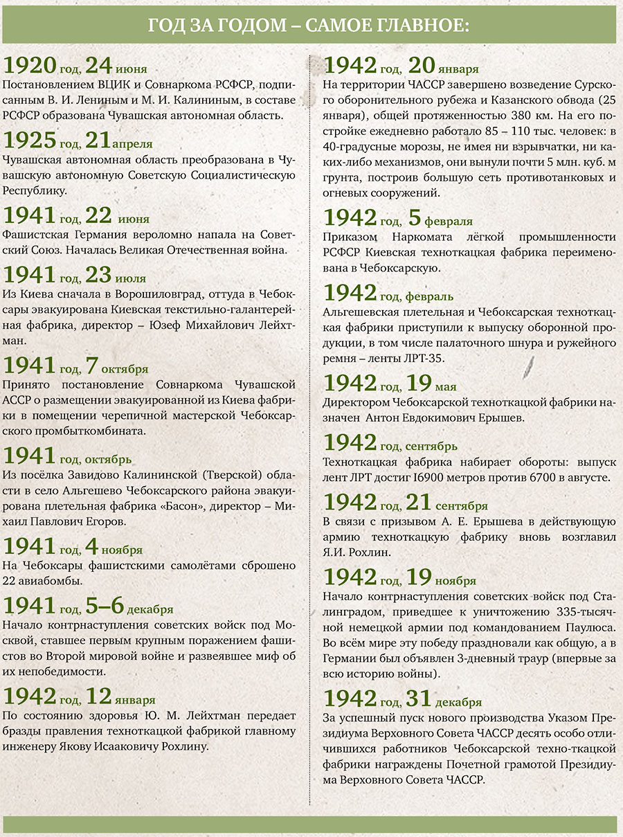 «Чебоксарская техноткацкая фабрика, как эвакуированное предприятие, в своей деятельности 1942 г. должна была осуществить основные задачи: