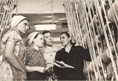 Одновременно готовились рабочие кадры красильщиков и красковаров. Первыми рабочими красильного цеха стали Григорьева З.Г., Курсова А.Н., Краснова Н. А., Михеева Л. А. Особо считаю нужным выделить Галину Ивановну Мясникову. Одарённая от природы смелостью, пытливостью, рабочей сноровкой, она удивительно быстро освоила красильное дело и заслуженно стала бригадиром. Во время её работы на агрегате лента меньше путалась, рвалась, оборудование меньше простаивало...»