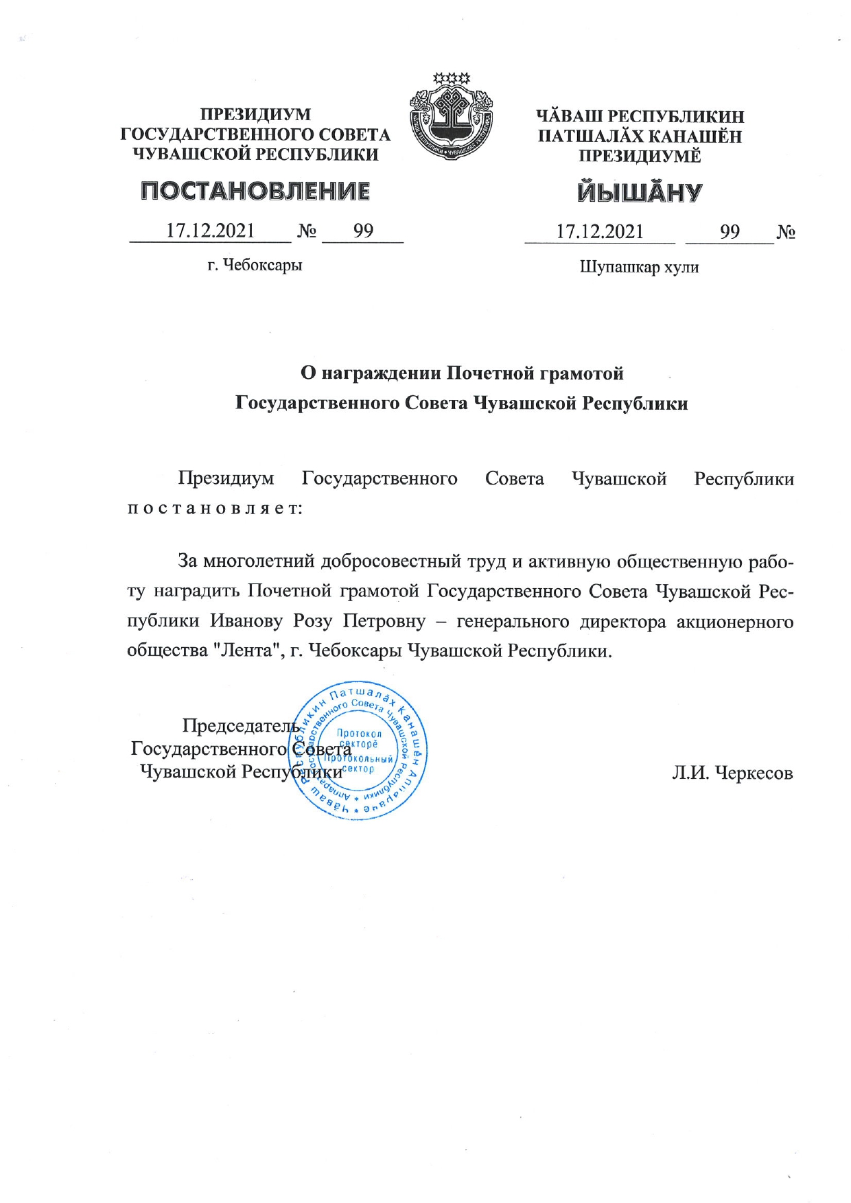 За многолетний добросовестный труд и активную общественную работу, Государственный Совет Чувашской Республики наградил генерального директора АО «Лента» Иванову Розу Петровну Почетной грамотой.