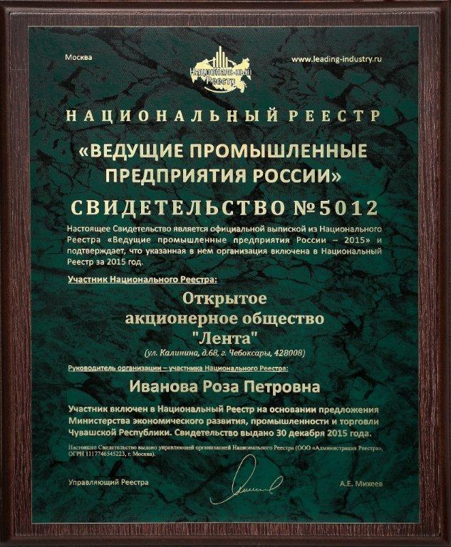 ОАО «Лента» в очередной раз подтвердило соблюдение действующего законодательства РФ в области поставок продукции (работ, услуг) и способность выпускать продукцию требуемого качества в установленные контрактами (договорами) сроки. Предприятие внесено в Федеральный Реестр добросовестных поставщиков за 2016 год с присвоением Сертификата соответствия.