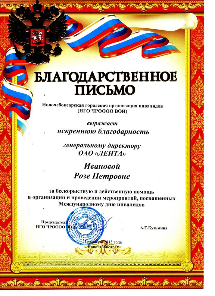 Новочебоксарская городская организация инвалидов (НГО ЧРОООО ВОИ) выражает благодарность Генеральному директору ОАО «Лента» Ивановой Розе Петровне за оказанную помощь в организации и проведении мероприятий, посвященных Международному дню инвалидов в 2013 году.